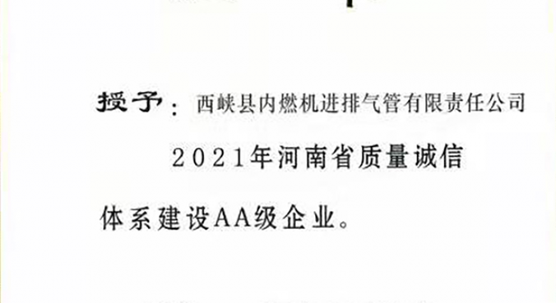 公司獲得“2021年河南省質(zhì)量誠信體系建設(shè)AA級企業(yè)”